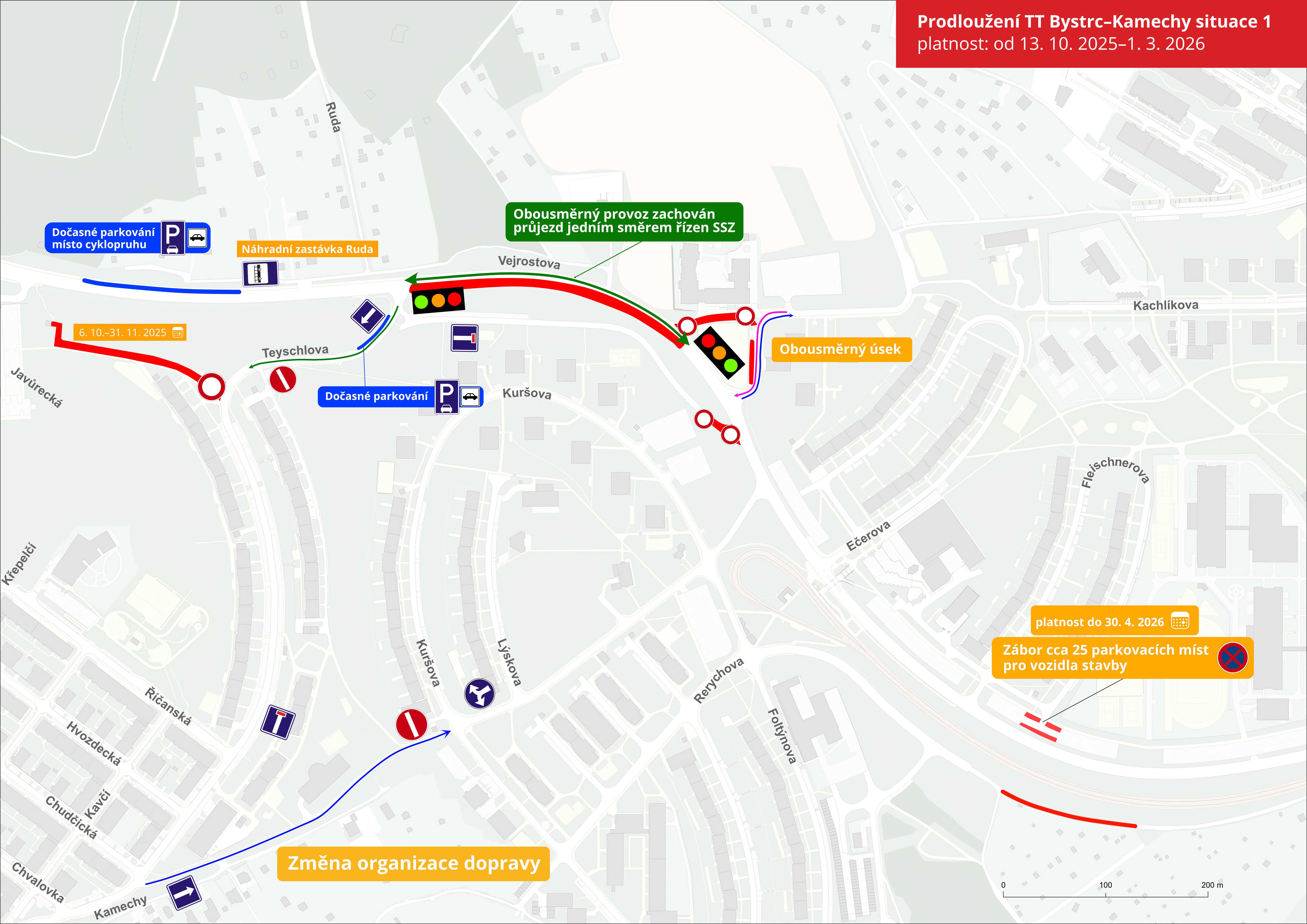 Individuální doprava: V první fázi přípravných prací dojde ke změně organizace silniční dopravy v několika úsecích ulic Kamechy a Teyschlova. V ulici Vejrostova bude krátký úsek v zúžení řízen semafory. podrobný přehled změn v individuální dopravě