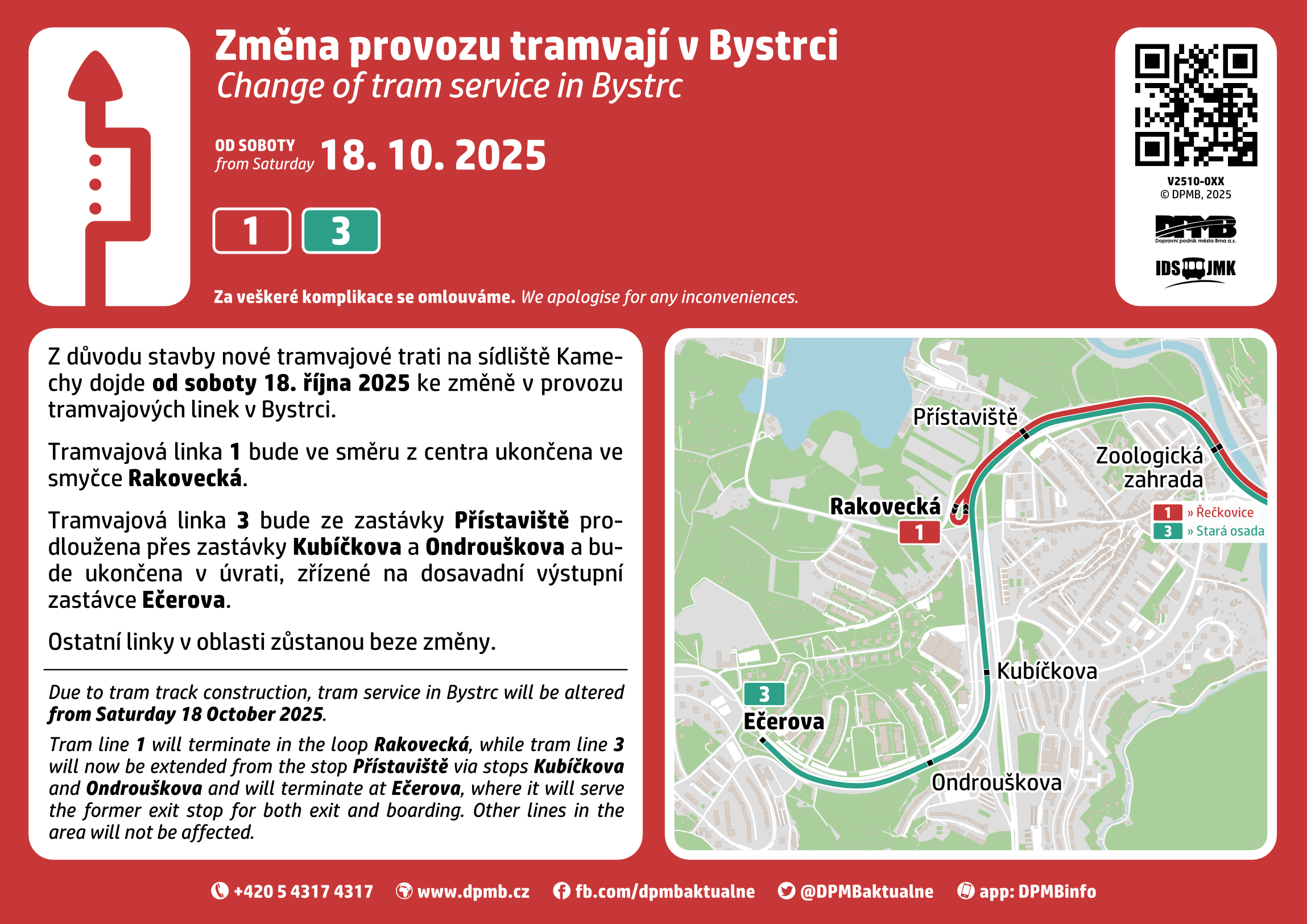 Hromadná doprava: Tramvajová linka 1 je ukončena už ve smyčce Rakovecká, zatímco linka 3 je prodloužena až na Ečerovu a ukončena úvratí. Výstup i nástup v zastávce Ečerova je možný na původní výstupní zastávce. podrobný přehled změn v hromadné dopravě